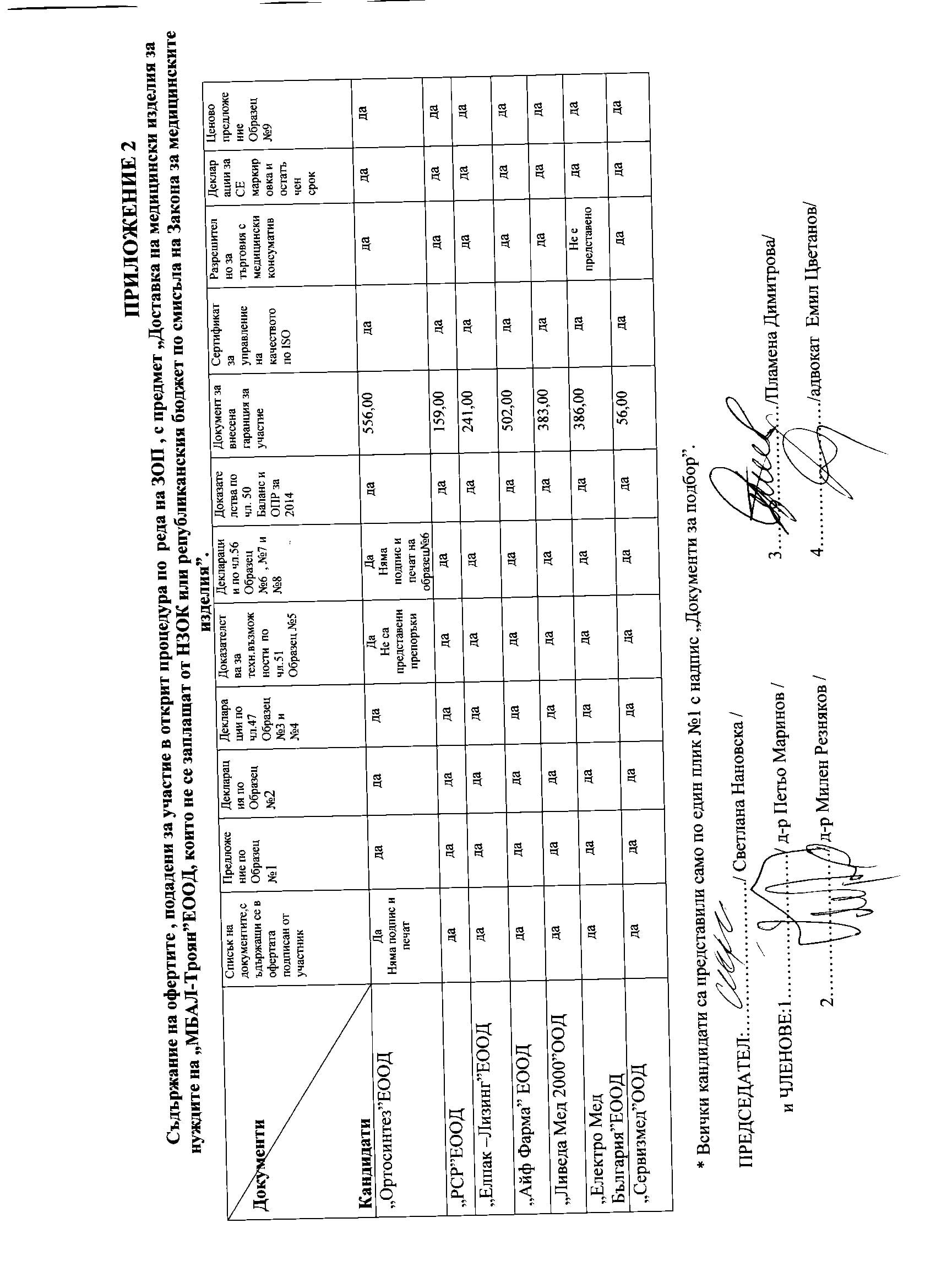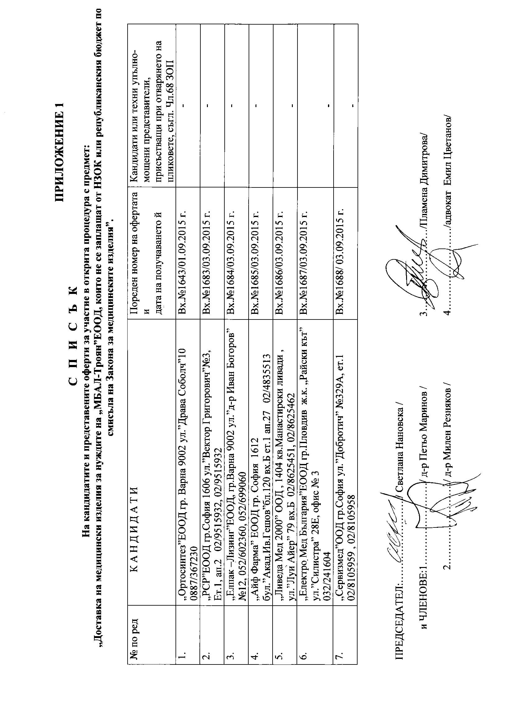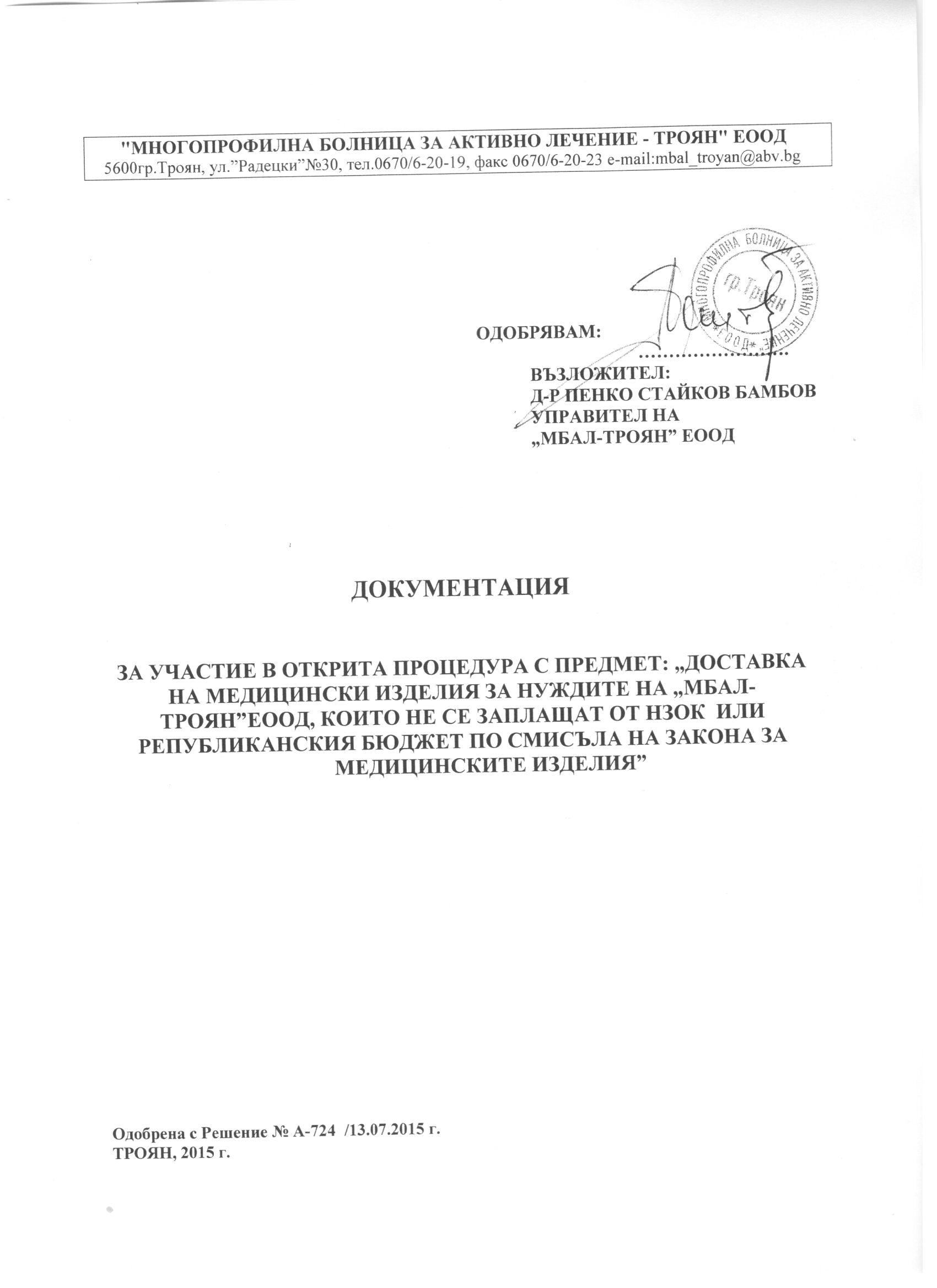 Eлектронно досие 5/ 13.07.2015. Открит конкурс с обект: „Доставка на медицински изделия за нуждите на „МБАЛ-Троян“ЕООД, които не се заплащат от НЗОК или Републикански бюджет по смисъла на Закона за медицинските изделия”