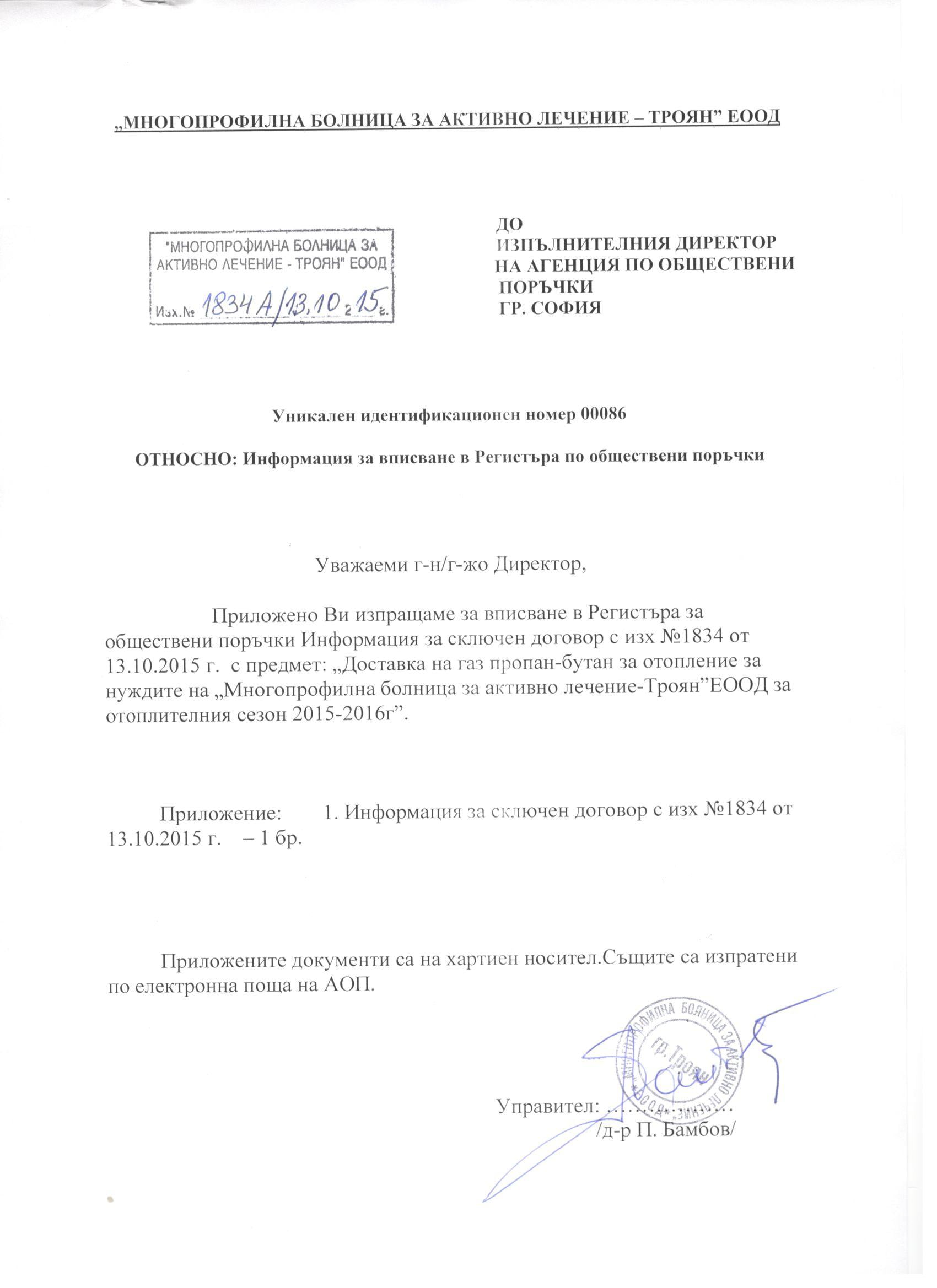 Eлектронно досие 6. Открит конкурс с обект: „Доставка на газ пропан бутан за отопление за нуждите на МБАЛ-Троян ЕООД за отоплителния сезон 2015-2016 г.”