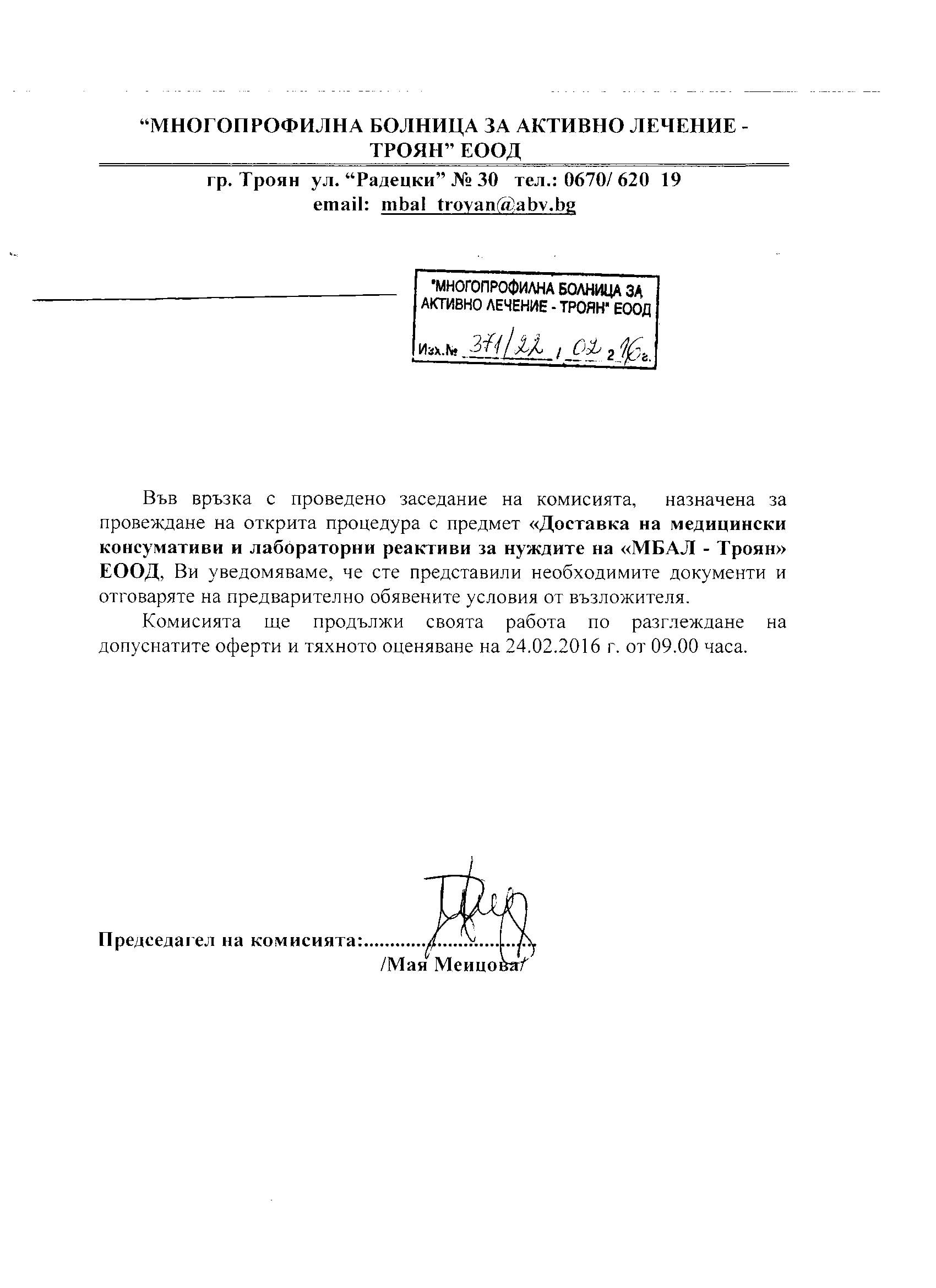 Eлектронно досие 7. Открит конкурс с обект: „Доставка на медицински консумативи и лабораторни реактиви за нуждите на „МБАЛ – Троян“ ЕООД“