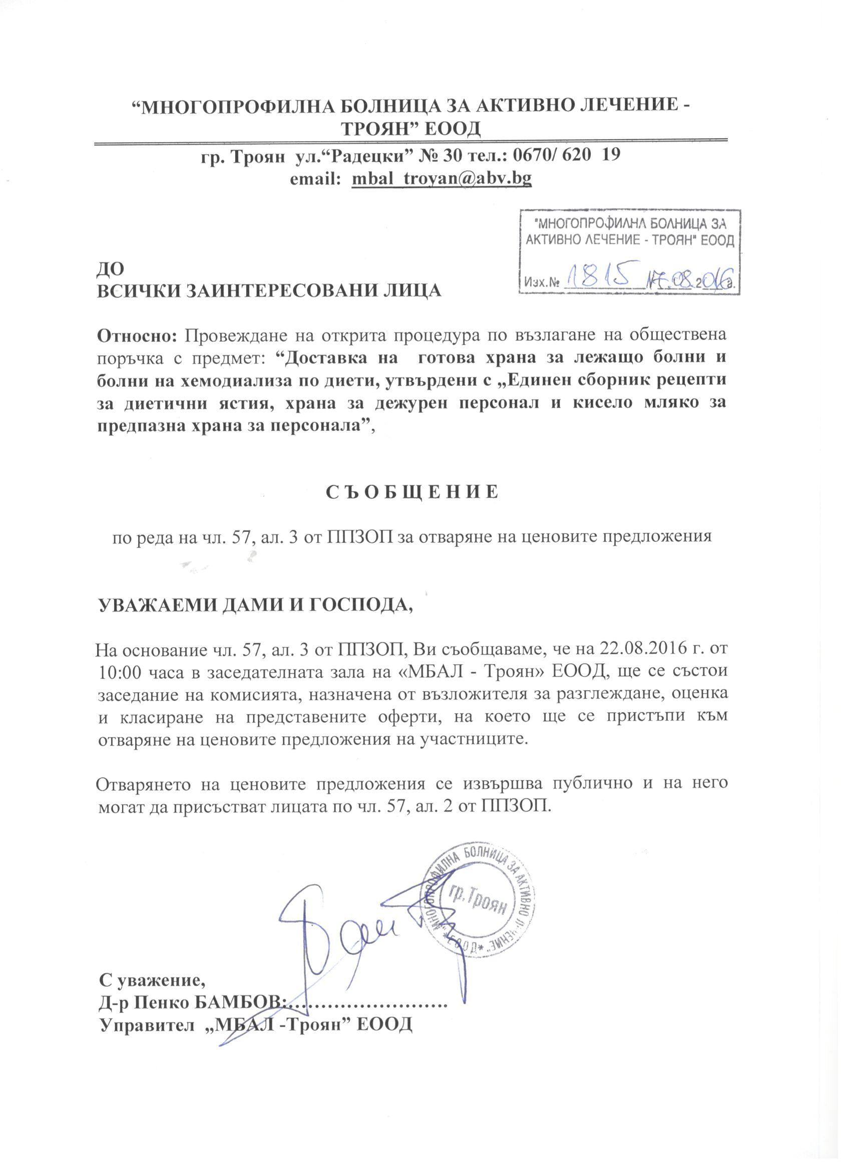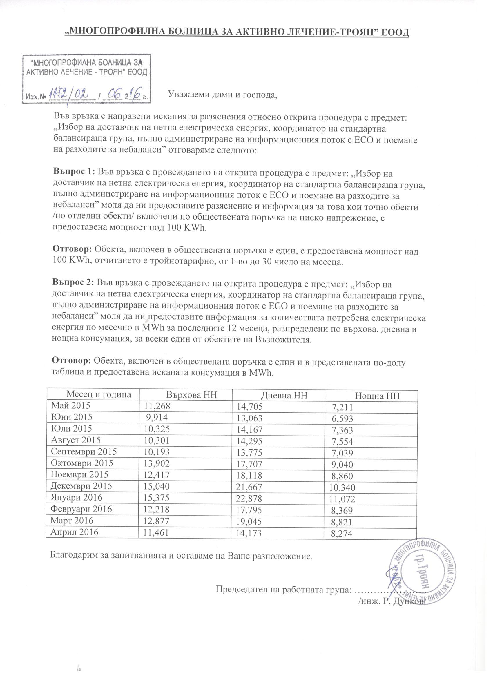 Eлектронно досие 11. Открит конкурс с обект: „Доставка на газ пропан-бутан за отопление за нуждите на МБАЛ-Троян ЕООД за отоплителния сезон 2016-2017г.“