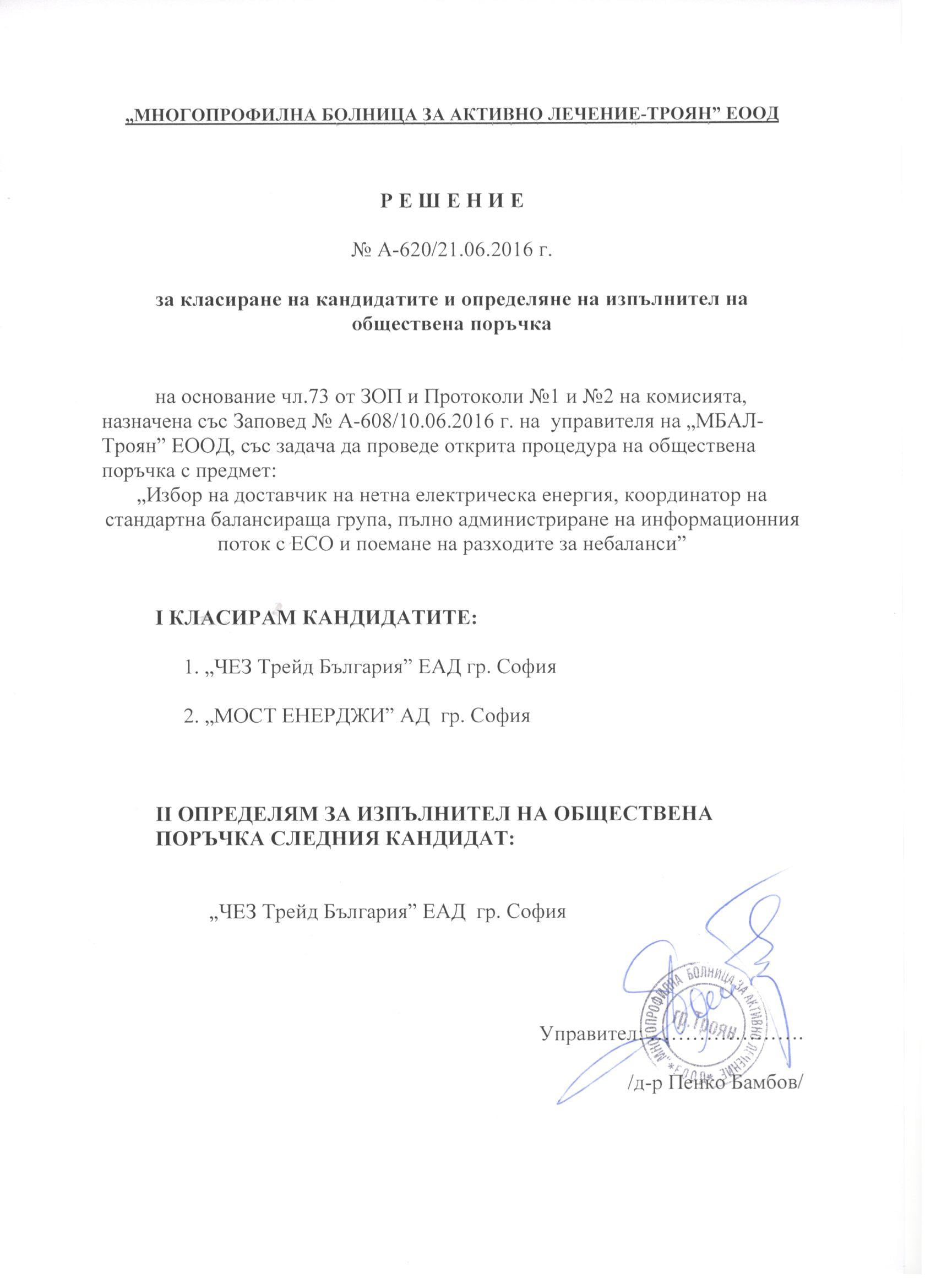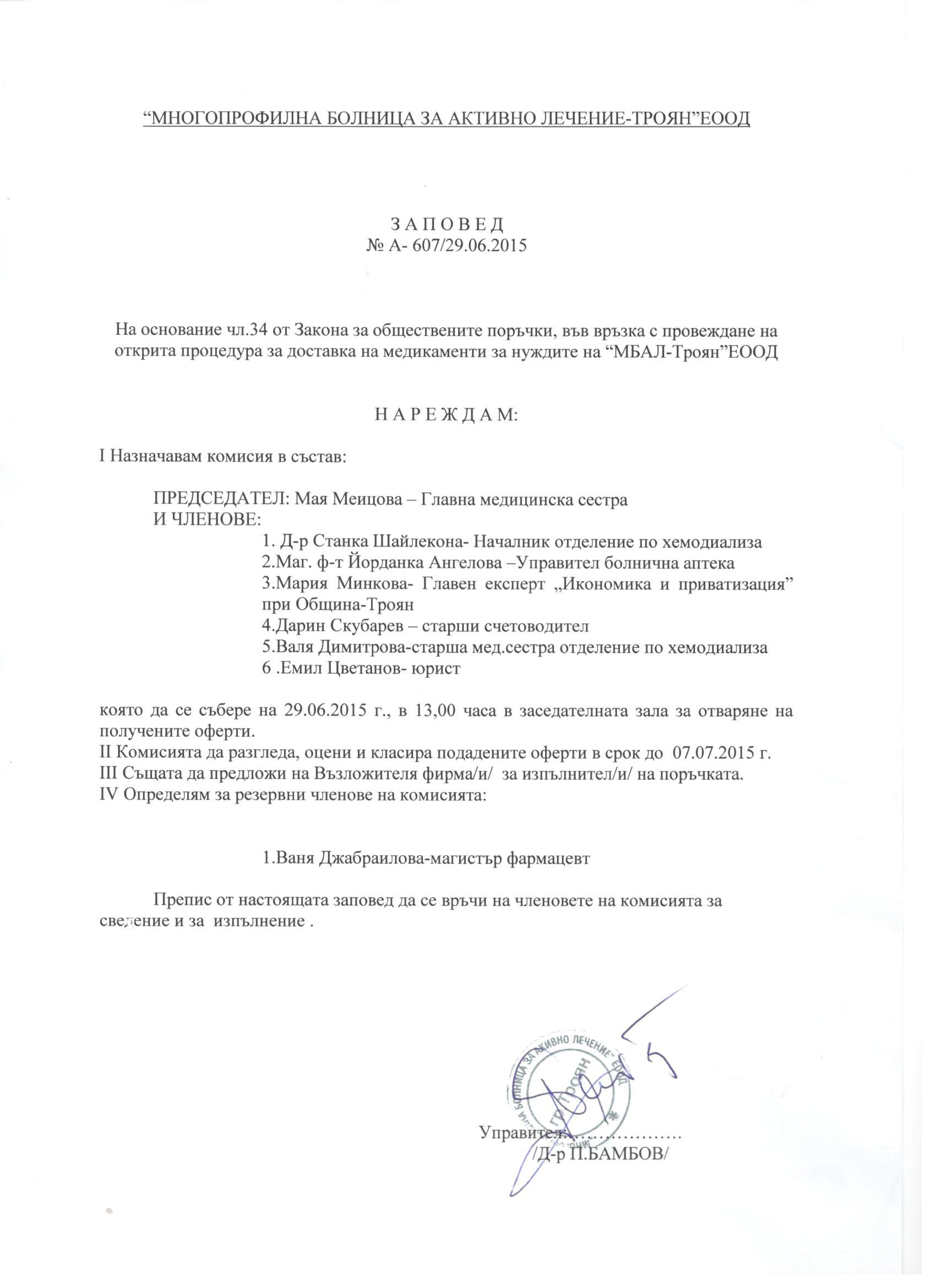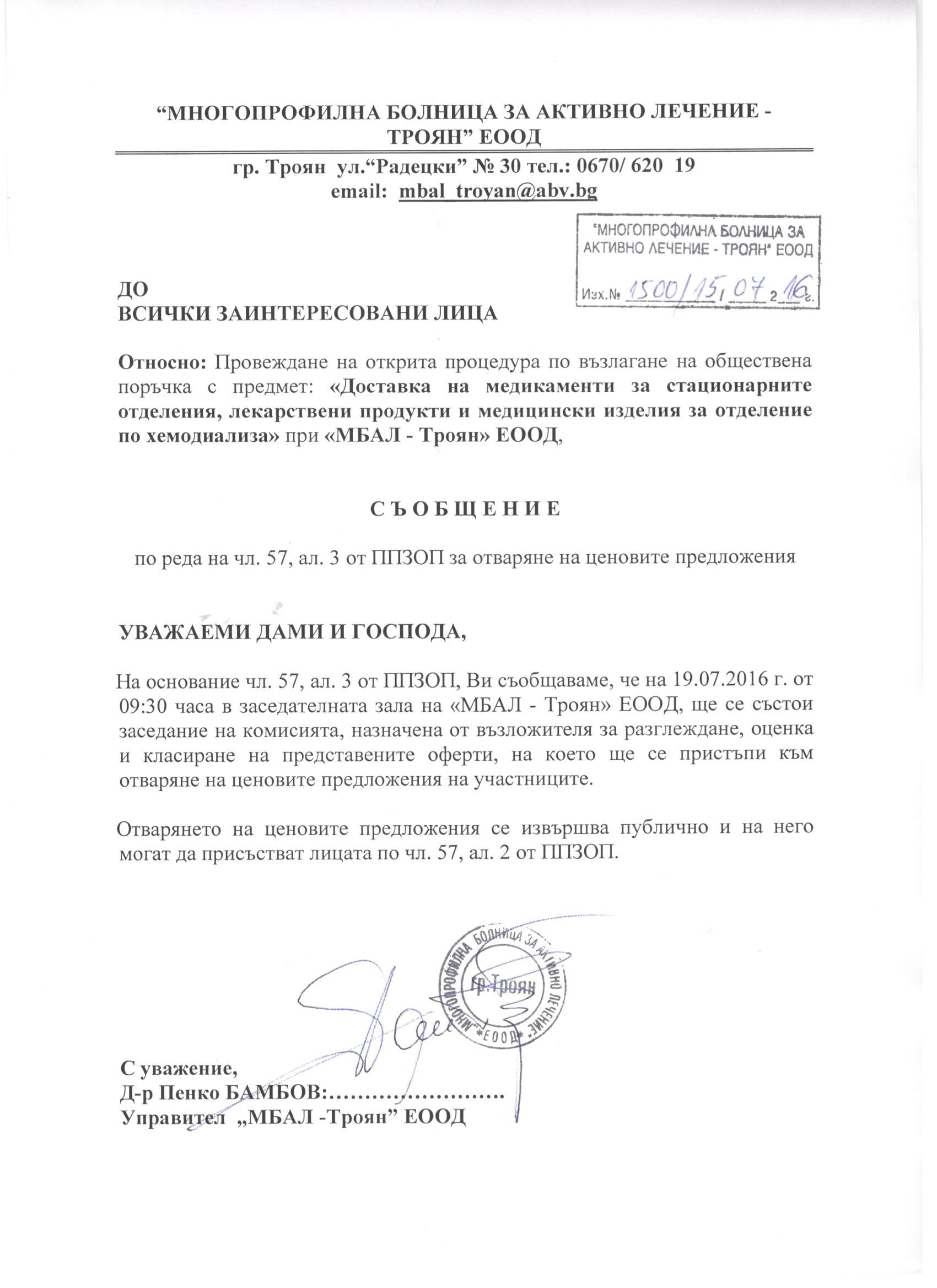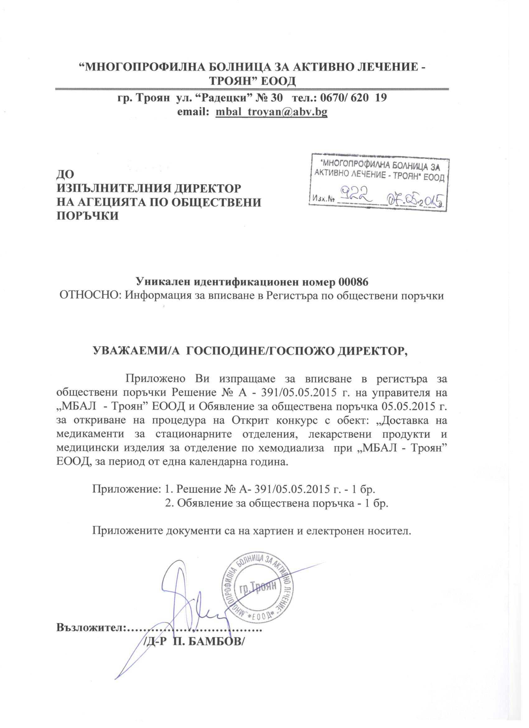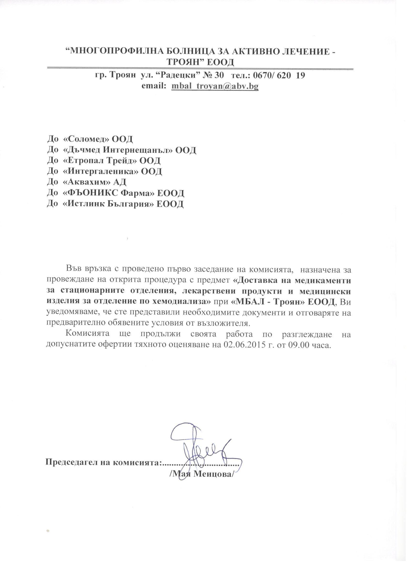 Eлектронно досие 3/ 07.05.2015. Открит конкурс с обект: „„Доставка на медикаменти за стационарните отделения , лекарствени продукти и медицински изделия за отделение по хемодиализа при “Многопрофилна болница за активно лечение – Троян” ЕООД, за период от една календарна година.