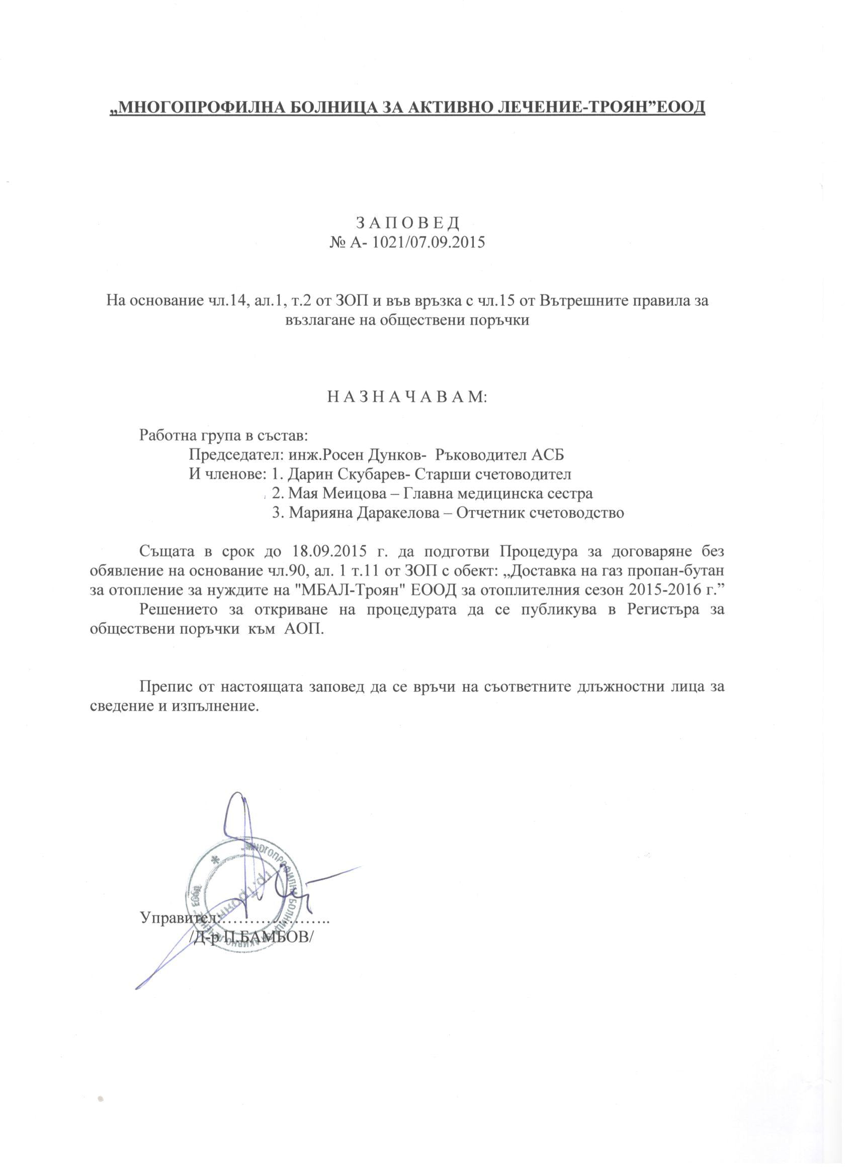 Eлектронно досие 1/ 03.10.2014. МБАЛ Троян стартира открита процедура за възлагане на обществена поръчка с предмет: „Доставка на газ пропан-бутан за отопление за нуждите на „МБАЛ-Троян“ ЕООД за отоплителния сезон 2014-2015 г.“