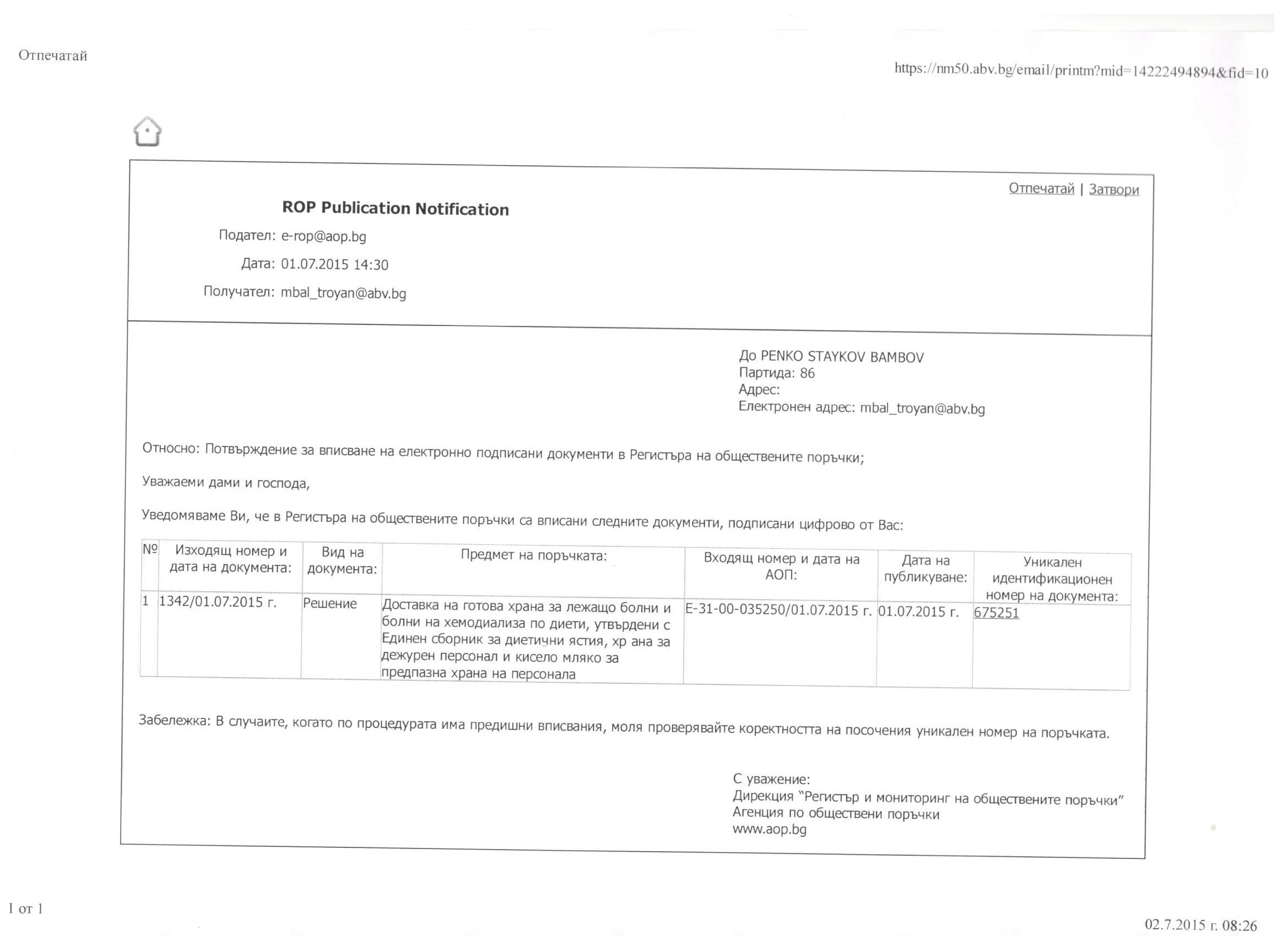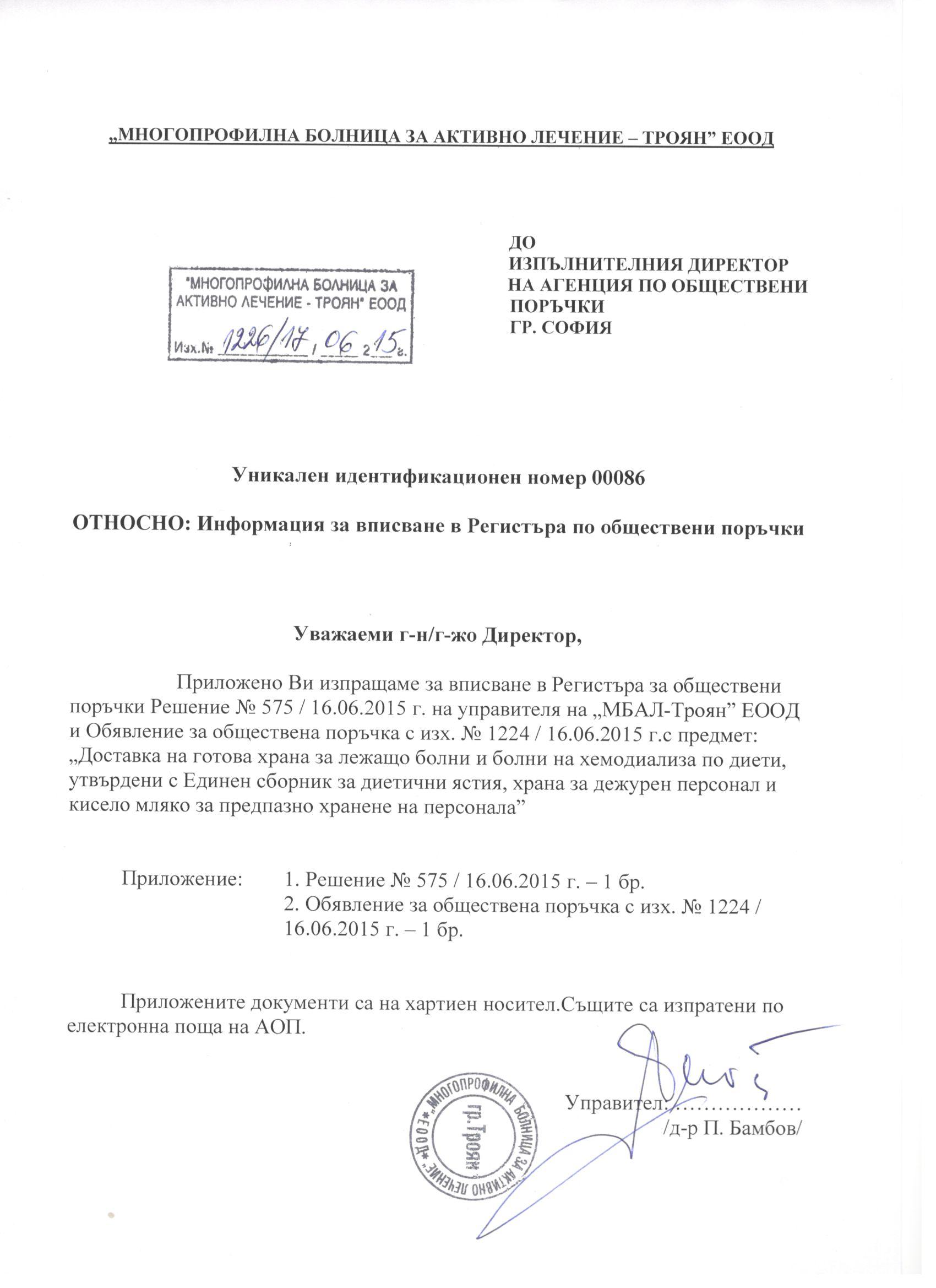 Уникален номер в регистъра на АОП: 00086-2015-0001