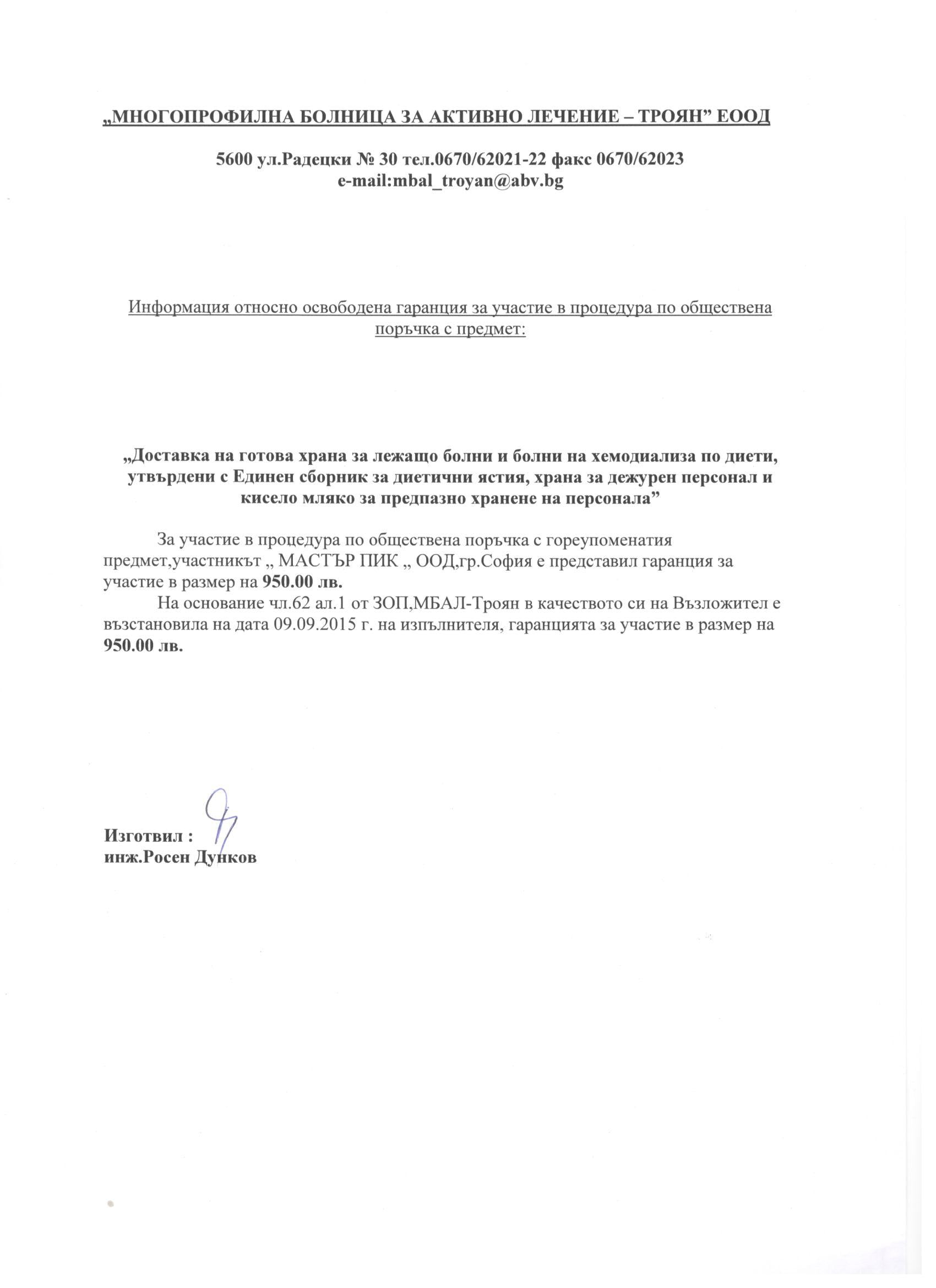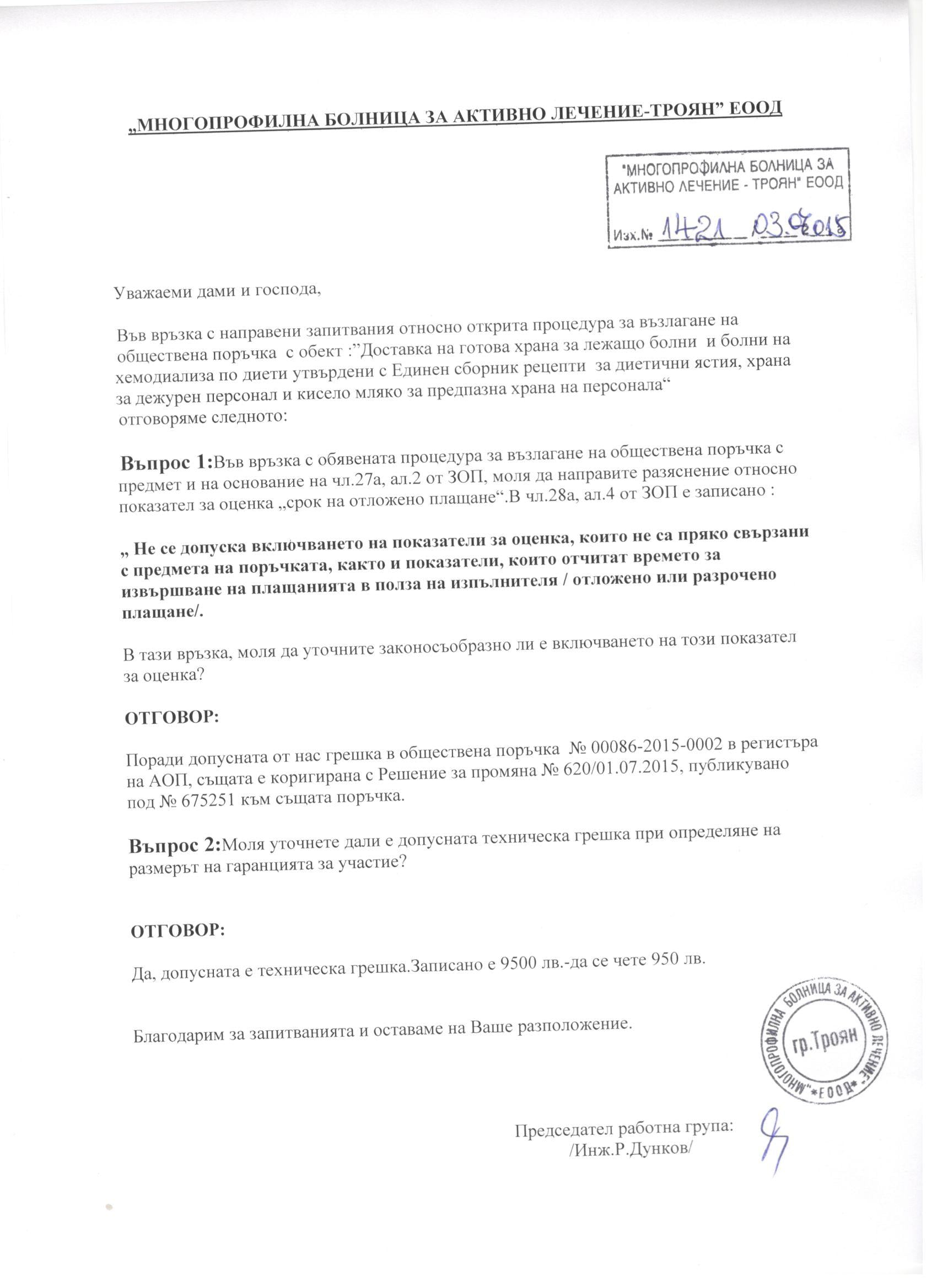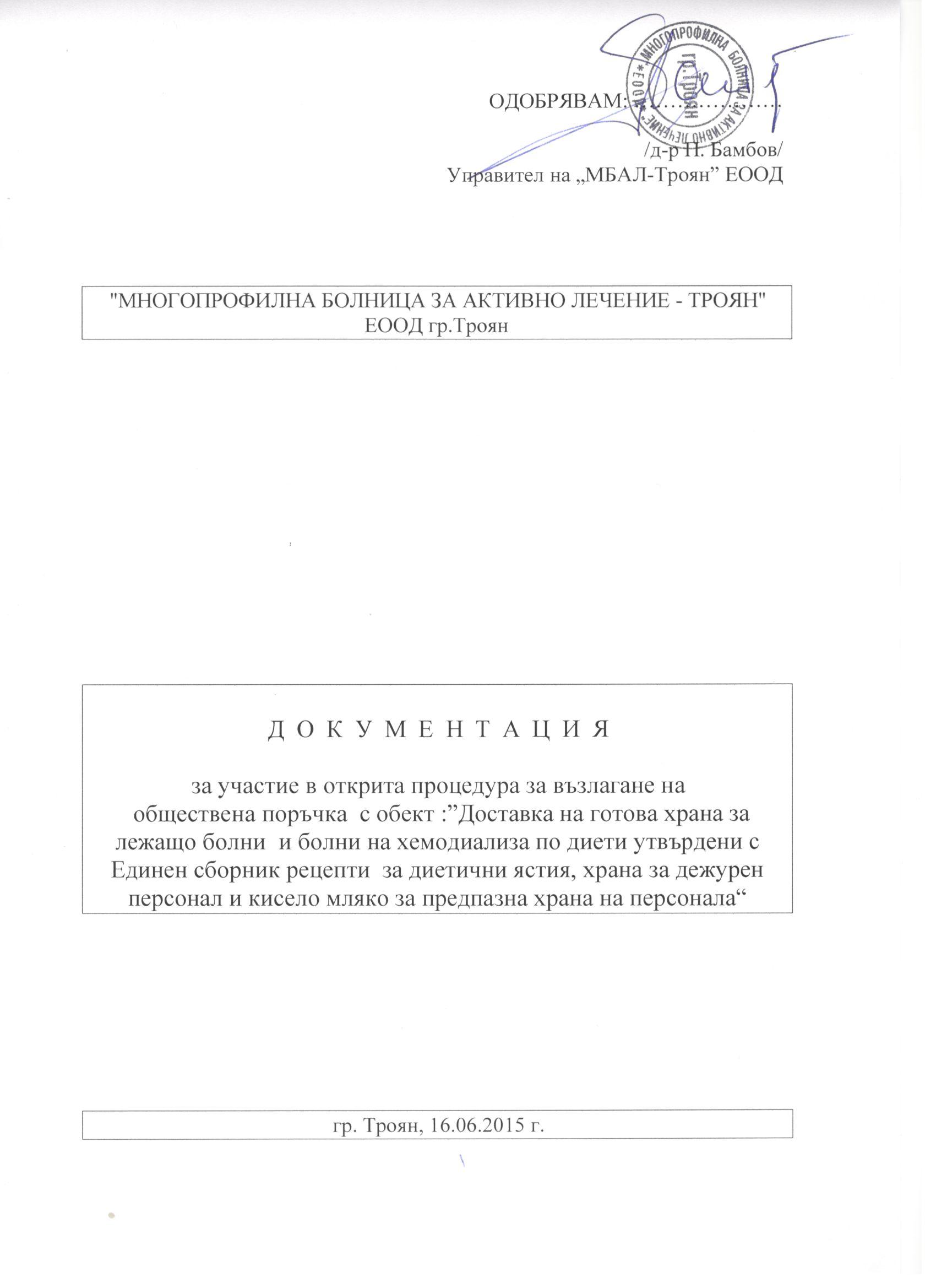 Eлектронно досие 4/ 16.06.2015. Открит конкурс с обект: „Доставка на готова храна за лежащо болни и болни на хемодиализа по диети, утвърдени с Единен сборник за диетични ястия, храна за дежурен персонал и кисело мляко за предпазно хранене на персонала”