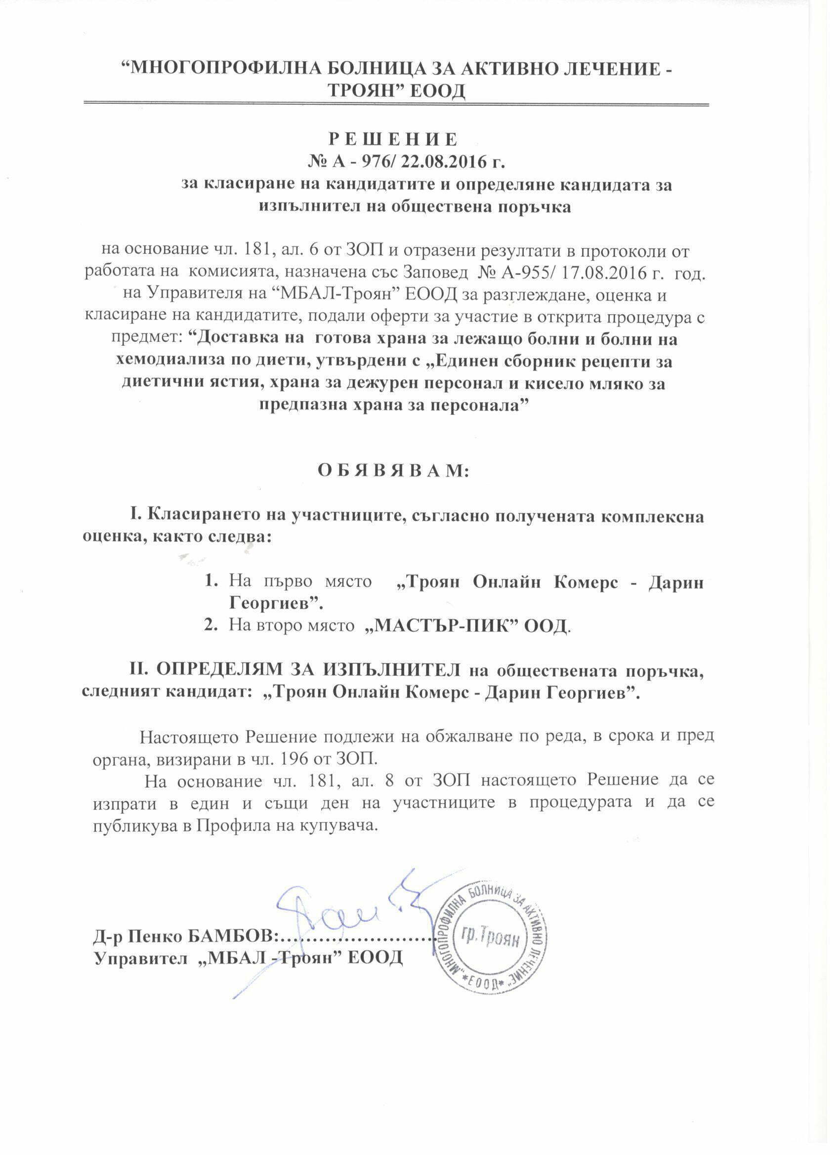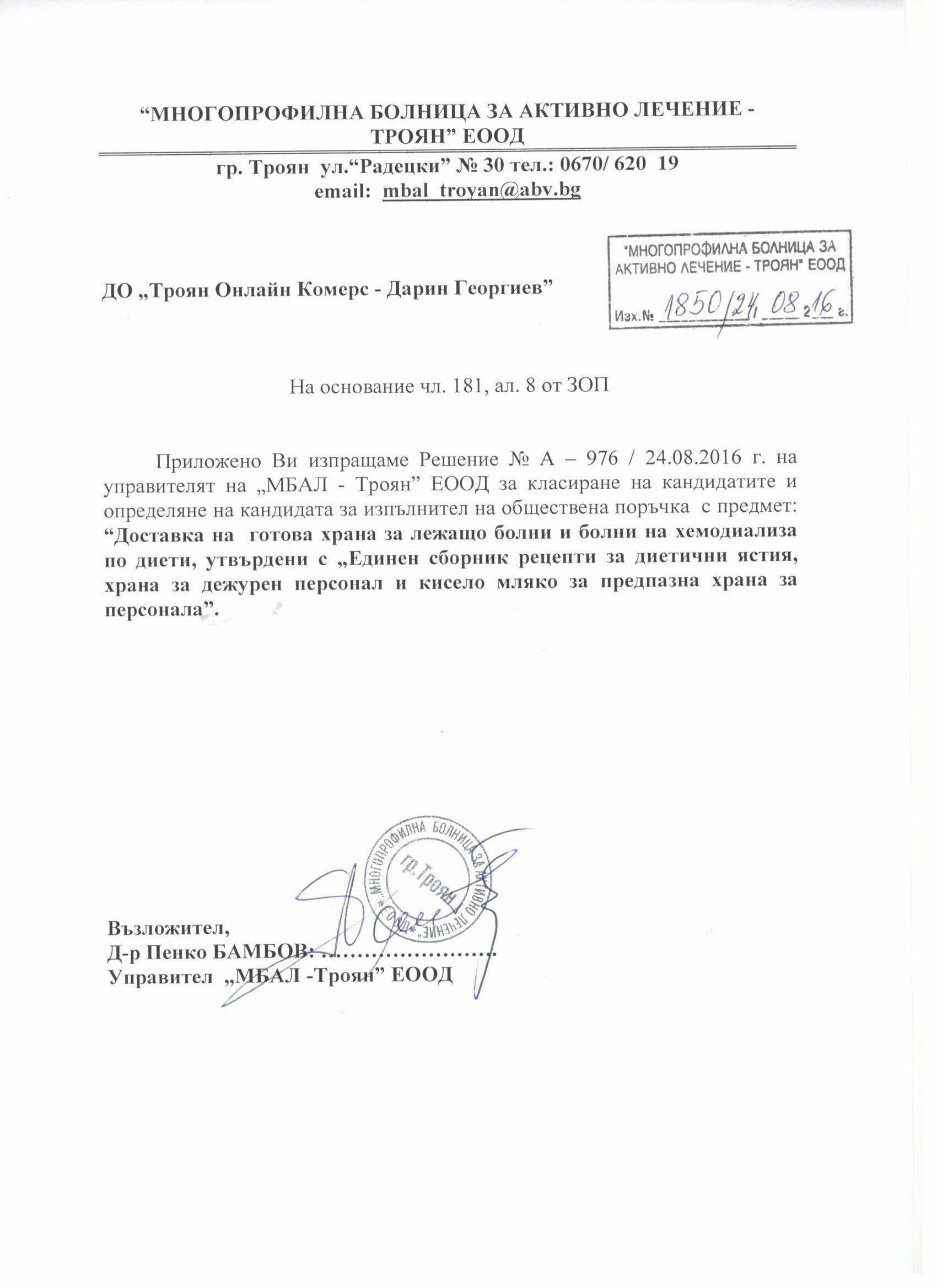 Eлектронно досие 9. Открит конкурс с обект: „ Доставка на медикаменти за стационарните отделения, лекарствени продукти и медицински изделия за отделение по хемодиализа при “Многопрофилна болница за активно лечение -Троян” ЕООД“